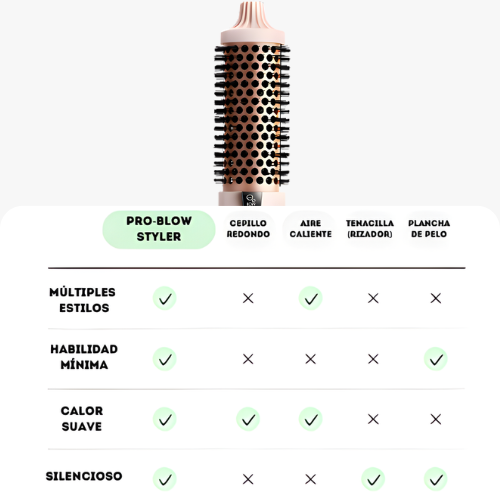 El PRO-Blow Styler no sopla aire, ya que no es un secador tradicional. Es un cepillo térmico diseñado para moldear el cabello seco.